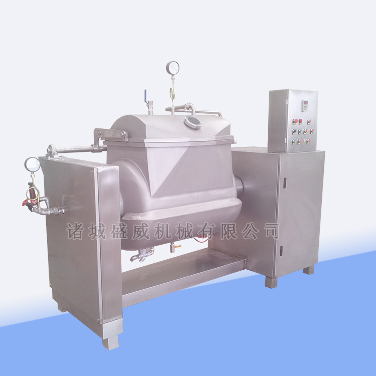 横轴搅拌炒锅的U形锅体顶部抽真空,夹套采用蒸汽加热,无段变速与蜗轮、减速机的组合传动,增大了横轴搅拌的办矩,采用聚四氟乙烯材质刮板的搅拌器,在物料的翻滚搅拌过程中,搅拌器与锅体的全方位充分接触,确保了无搅拌死角。锅体的开盖、卸料、复位采用液压、机械传动控制,操作极为方便。真空炒制可降低炒制温度,特别适应于热敏原料的炒制,避免了因过度受热引起颜色及口味的劣化,保持了原料原有的色、香、味。提高了炒制效率,并降低了能耗,缩短了炒制时间。