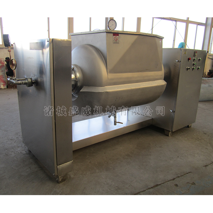 横轴搅拌炒锅的U形锅体顶部抽真空,夹套采用蒸汽加热,无段变速与蜗轮、减速机的组合传动,增大了横轴搅拌的办矩,采用聚四氟乙烯材质刮板的搅拌器,在物料的翻滚搅拌过程中,搅拌器与锅体的全方位充分接触,确保了无搅拌死角。锅体的开盖、卸料、复位采用液压、机械传动控制,操作极为方便。真空炒制可降低炒制温度,特别适应于热敏原料的炒制,避免了因过度受热引起颜色及口味的劣化,保持了原料原有的色、香、味。提高了炒制效率,并降低了能耗,缩短了炒制时间。
