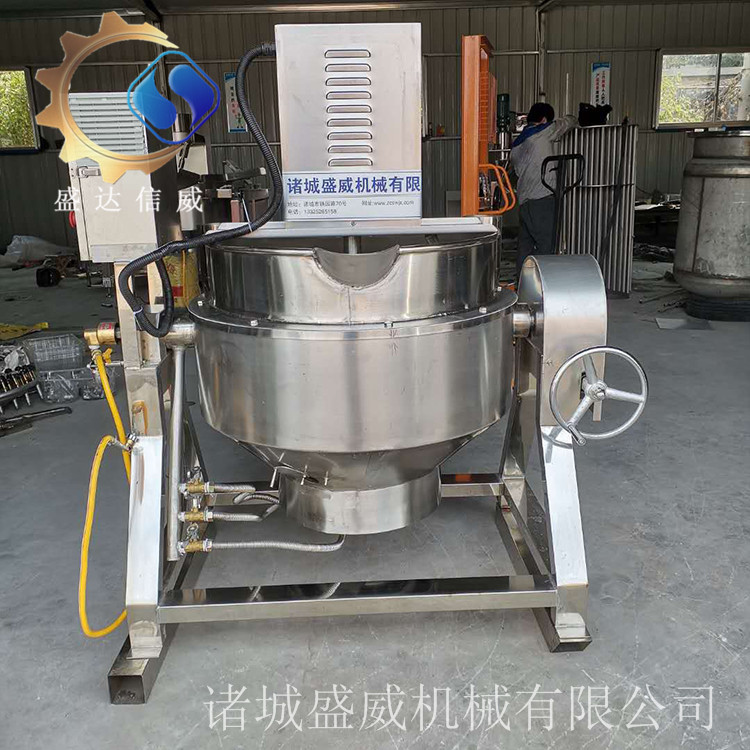 3.燃气加热夹层锅:该设备主要由锅体、底座、燃具及倾锅装置等部分组成。打开气阀,点燃燃气,人工加入食用油待油温达到烹饪温度时,加入适量的物料,人工翻锅、搅拌,使物料在锅里均匀受热。待物料加工完毕后,关气熄火转动手柄,通过蜗轮、蜗杆传动装置,使锅体旋转倾斜,将物料倒入另一容器内。