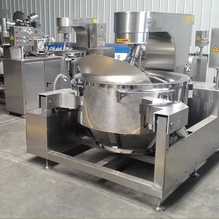 行星搅拌炒锅体为一次冲压成型的半球形不锈钢锅体,采用蒸汽、液化气、天然气、电加热导热油等加热形式,搅拌方式采用倾斜式传动,使用的行星式搅拌器与锅体充分接触,实现传动公转与自转的不整数传动比,使锅内无搅拌死角。使用先进的传动与密封结构,使传动部分与锅内洁净、卫生。采用变频调速动力,运行更平稳。另本机采用液压升降,翻锅运料,免拆装搅拌器,节省人力,降低劳动强度,是性能优良的食品加工设备。